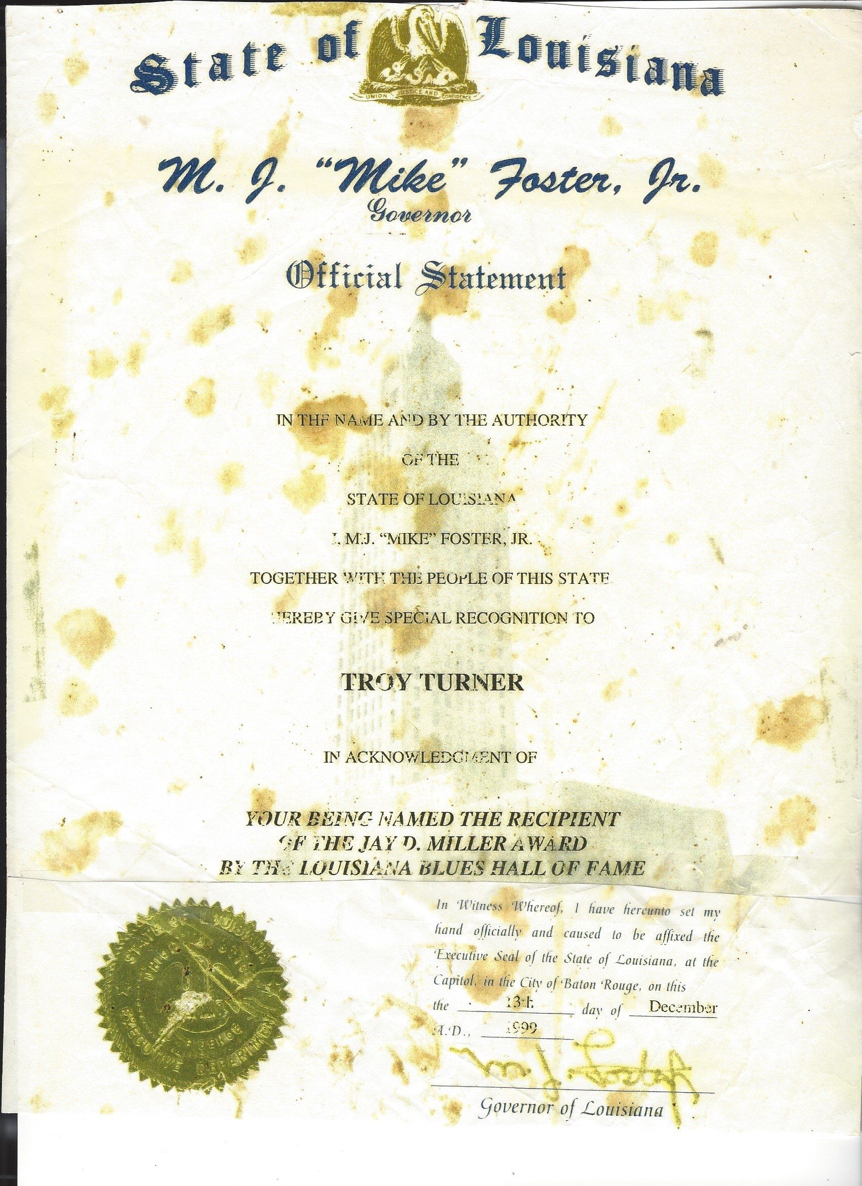 Troy Turner was the youngest inducted in the Louisiana Blues Hall of Fame. He was presented this Jay D. Miller award by Governor Mike Foster. 1999